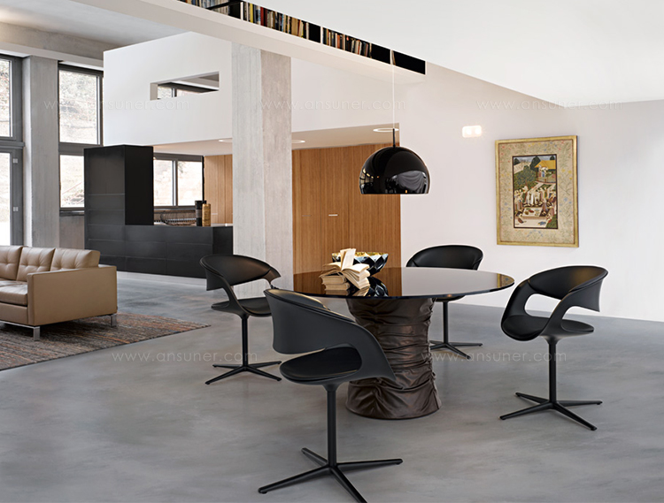 圆形茶几,这是一个家人、朋友聚在一起的地方,在这里,你们可以一起讨论一件事或者享受美食。最原始的欢乐。风箱式的餐桌体现了魅力和生活态度。柔软的皮革和玻璃搭配,稳定的底座和精致的桌面,温暖而凉爽的材料组合在一起创造出独特的效果。