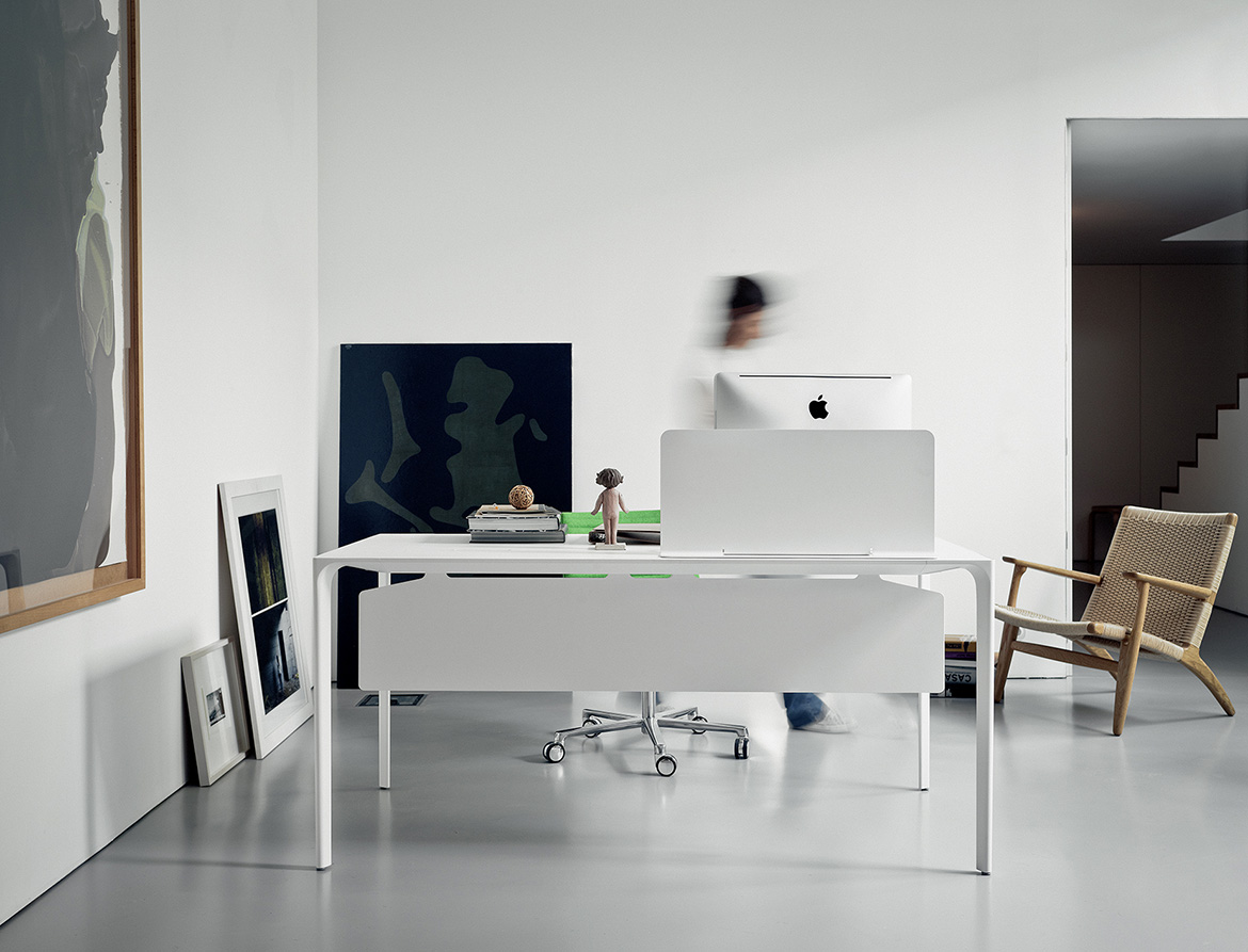 Nuur有方形或矩形两种形式,层压顶部有多种颜色可供选择,也可采用木饰面板制成。 高度可调节的结构采用抛光或涂漆铝制。