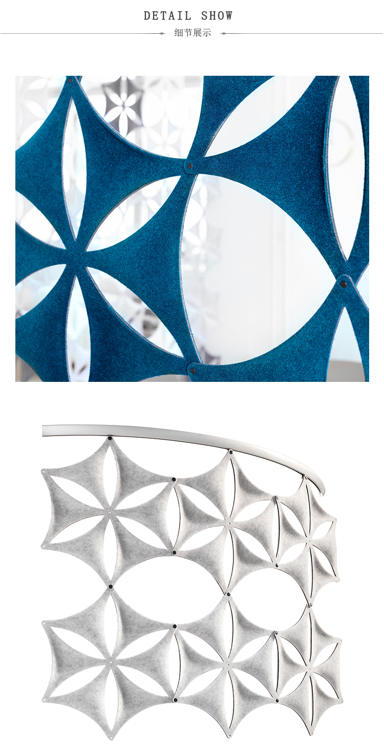 Aiflake / Airflake XL是一种基于六边形的模块化系统,可以自由组合以形成悬挂式隔断。Airflake散发出令人不快的声音反射,非常适合拥有大型开放区域的房间。Airflake由模制纤维毡制成。模块可以与塑料夹连接以产生不同类型的图案形成。使用直的或弯曲的白色或银色阳极氧化铝导轨,电线或假天花板固定在天花板或墙壁上