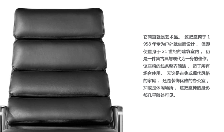 Charles与RayEames夫妇是20世纪最有影响力的设计师,卓越的设计涵盖了家具、建筑、影像与平面设计。他们从二次世界大战中美国海军的实验计画中学习经验并发展可谓是现今工业中使用模铸胶合版的先锋,这对设计界的超级夫妇档自1940年参与了由MOMA举办的有机家具设计大赛,自今已有近百件他们的作品被各大博物馆所永久典藏。Eames® Soft Pad Executive Chair(伊姆斯软包大班椅)是夫妻俩1958年设计的,是在全铝系列的基础上发展的另一系列Eames产品。舒适系列在全铝的椅架上增加了皮革制的柔软坐垫和靠背,高级铝合金制作,压模五星脚,可旋转。背垫和坐垫,采用西皮,具有透气性强,内部填充高密度定型绵,不易变形,不老化,依人体坐姿,符合人体工学,耐水及对人体无害等优势。椅子扶手选用优质电镀铝合金扶手,手感舒适,永久不生锈。转椅底盘为多功能底盘,可以保护使用者长时间坐用腿部健康,且作为高度可多定位调节。气压棒采用的气杆是正规厂家出产的外贸气杆,每一根气杆都有钢印,经过严格SGS检测的才可出厂,旋转、升降自如基本无声响,使用寿命长,可承受250kg,可升降数万次,将椅面调至与膝盖同高时,使用者坐下后双脚跟可垂直平放于地上,且大腿与地面平行,最符合人体工学理论,使用者长期久坐,也不想疲惫。办公椅脚为铝合金材质永久不生锈、承受能力强,安全更放心。椅子脚轮采用优质电镀片脚轮,耐用而美观,可以随意变换位置,贴心更方便,具有防震及防松脱,让椅子的安全性能更加可靠。