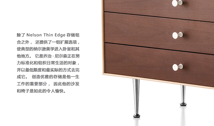 除了Nelson Thin Edge存储组合之外,还提供了一组扩展选项,使典型的纳尔逊美学进入卧室和其他地方。 它是乔治·尼尔森正在努力标准化和组织日常生活的对象,并以最低限度和最实际的方式去完成它。创造优雅的存储是他一生工作的重要部分,因此他的沙发和椅子是如此的令人愉快。