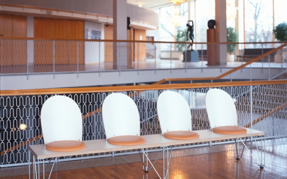 伯格·林道· 约翰·林道(Börge Lindau, Johan Lindau)共同设计GATE,门是公共区域的可链接长凳系统。长凳有两个笔直和两个弯曲基本单元可用。使用门基本单元形成直行,弯曲或直角的行以适合其设置。可以根据需要配备靠背和/或座椅。座椅:圆形或直形软垫。靠背:圆形,直形,整体软垫。台式胶合实心桦木厚40毫米。镀锌钢框架。皮革或织物覆盖的软垫座椅。阻燃聚醚泡沫塑料内饰。压缩桦木靠背。座椅高度420 mm,总高度890 mm(含靠背),总深度460 mm,座椅Ø。 390毫米,CC座650毫米,长度,2座1200毫米,长度,3座1800毫米,圆形,1,5座45°,圆形,2座60°。