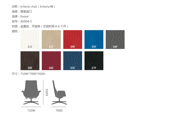 Kastel是一个在室内装饰领域极具影响力的公司,该公司具备高水平的综合生产能力,是一个充满活力的公司。Kastel公司产品多种多样,包括办公座椅,社区座椅和家庭座椅等等。Kastel在对人体工程学进行深刻研究之后,制定了现在的生产线,产品的设计以舒适为主,在生产过程中每一步都严格遵循这一宗旨,为客户提供高性能的产品,满足客户对舒适的基本要求。这也是Kastel公司的经营理念。kimera系列办公椅采用全真皮扪面、可同步升降、旋转、可倾仰锁定,符合人体工学,高档舒适,是办公,会议的理想选择。