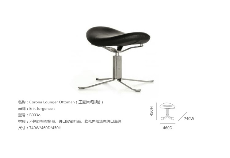 Poul M. Volther 于1964年的设计的王冠躺椅家具系列,是Poul M. Volther最知名的现代家具设计作品,此系列包括Corona Lounger Chair(王冠躺椅)、Corona Lounger Ottoman (王冠休闲脚踏)及其组合Corona Lounger Chair and Ottoman(王冠躺椅&脚踏)。历经40余年的今天,其作品在纷繁现代家具设计中仍占有一席之地。椅子充满了雕塑感,斯堪德维亚风格的简洁外形和舒适的坐感都是这张椅子成为创世之作的原因,四个椭圆形组成一张独特的椅子,无论摆放在哪,都令人过目不忘。此系列家具采用高强度钢材制作,表面电镀处理,外面为真皮或布艺制作,可360度旋转,不可后仰。适用范围广,酒店、会所、高档餐厅、夜总会、别墅等。