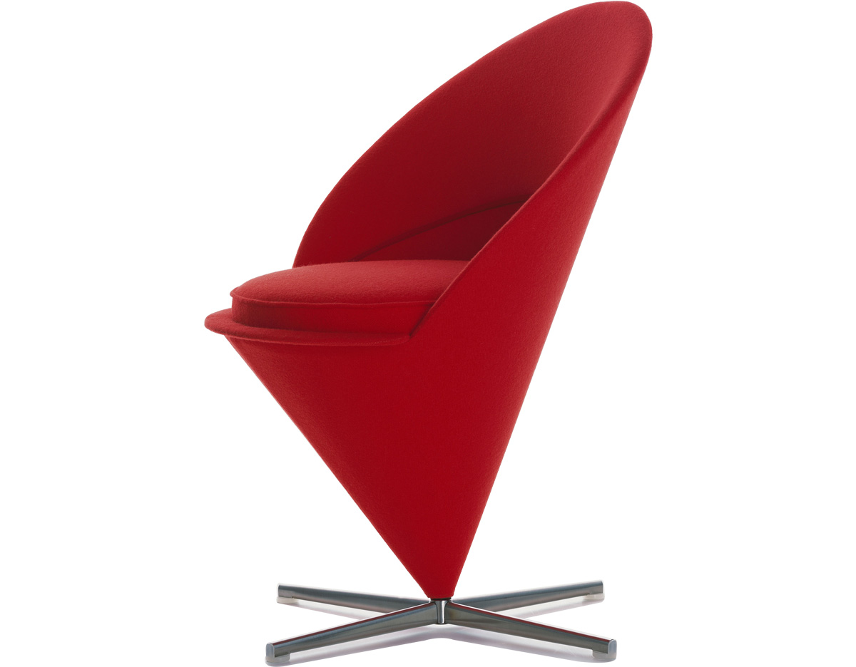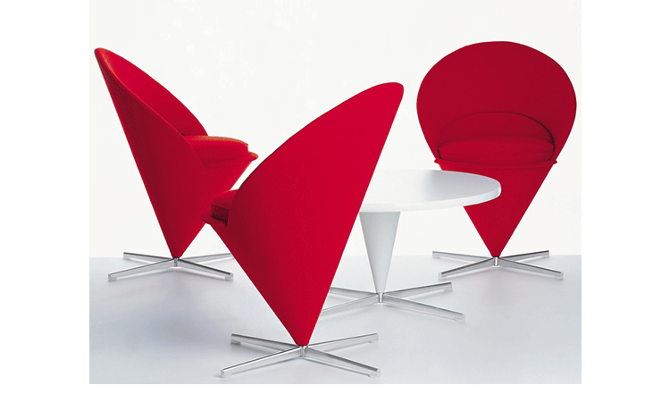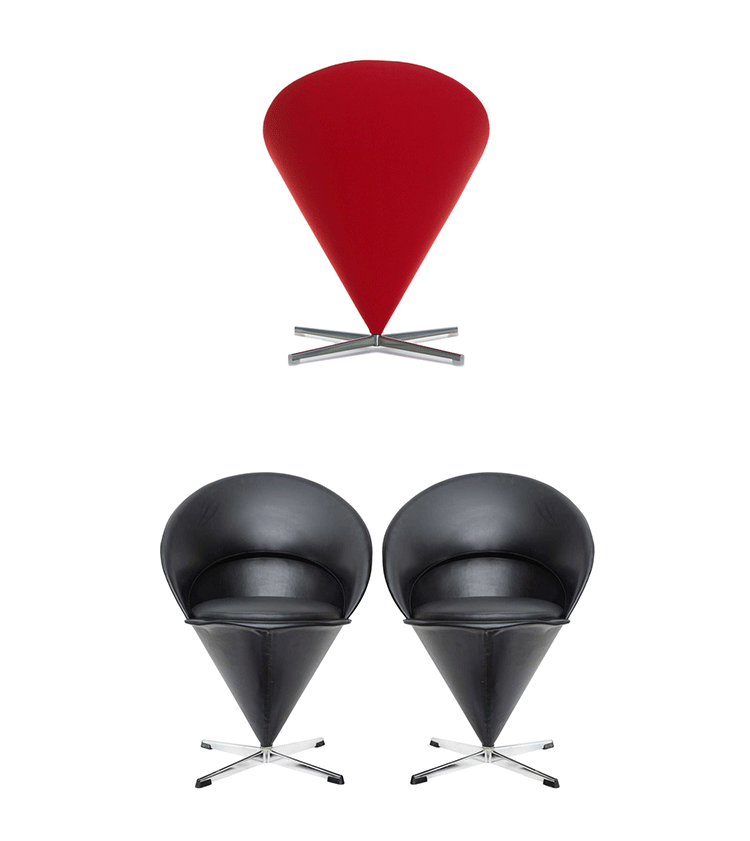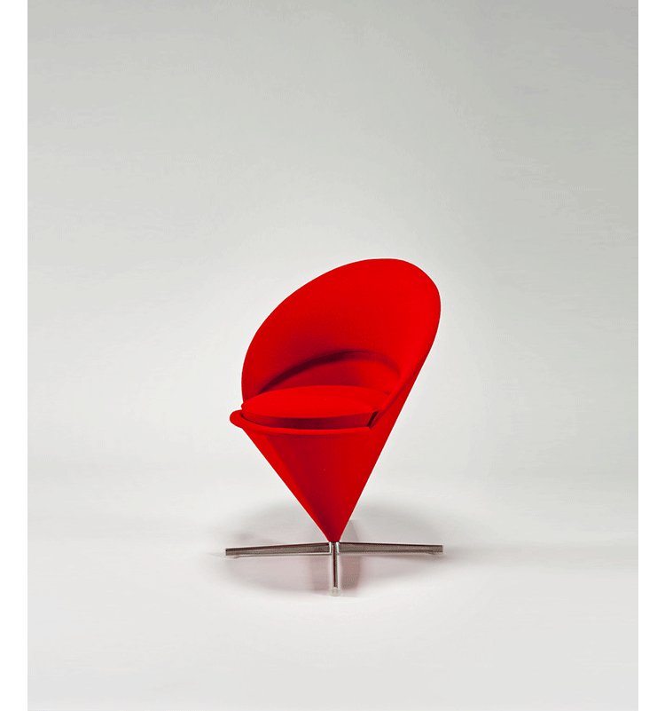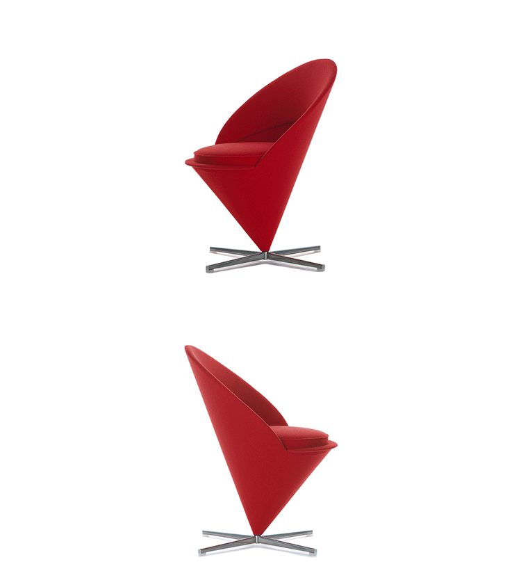 Cone Chair 讓 Verner Panton 引燃國際對他的注目,以鋼管骨架塑形而出的幾何造型,外覆羊毛布料或是皮革,在當時崇尚自然材質的北歐風格裡獨樹一幟。原本 Verner Panton 只是想替家人所開設的餐廳設計出一張特別的椅子,當紅色的 Cone Chair 出現在餐廳後,立即被家具商看上而簽下生產,隨之而來,大量的雜誌媒體披露,也讓一張椅子產生了全球為之瘋狂的震撼力,一直晃盪到歐洲以外的地方。緊接著 Cone Chair 的成功,隔年亮相的 Heart Cone Chair 也再次成為全球設計話題焦點。