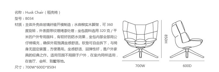 稻壳扶手椅 (Husk Armchair)是著名的西班牙设计师帕奇希娅·奥奇拉在2011年设计的户外家具,稻壳扶手椅(Husk Armchair)在米兰家具展中成为了最让人瞩目的一款户外家具,带有扶手,它的每个部件都经过精心的设计,创意的设计、柔软的坐感、独特的外观,给用户提供了一个现代、舒适、简约的休息体验。面料有红、绿、蓝、灰白四色,因为是新品,如果客户有需要,我们可以为客户定做其他颜色的Husk Armchair。