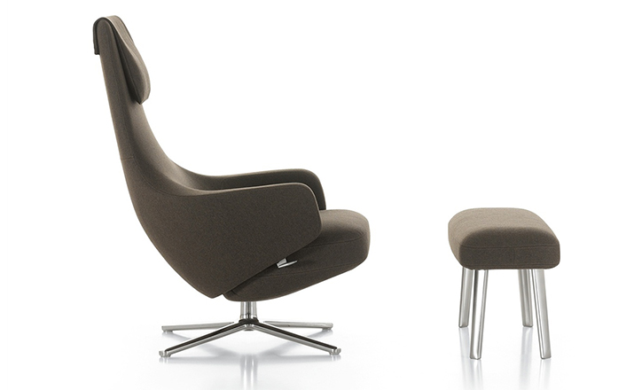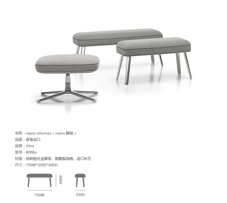 repos lounge chair and ottoman(repos休闲椅&脚踏)由设计大师Antonio Citterio所设计。repos系列休闲椅采用钢制铝合金脚架、聚氨酯海绵填充、高级布艺扪面,可随意调整坐姿和高度,也可以放平躺,配上舒适的羽毛衬垫,无论阅读或者休憩,都非常舒服,符合人体工学,高档舒适,是办公,会议的理想选择。意大利设计师和建筑师 Antonio Citterio赋予了这边椅子永恒的优雅气质与无与伦比的舒适,是当代设计的经典,无论用在办公、商业、家庭都是非常高贵大气的。