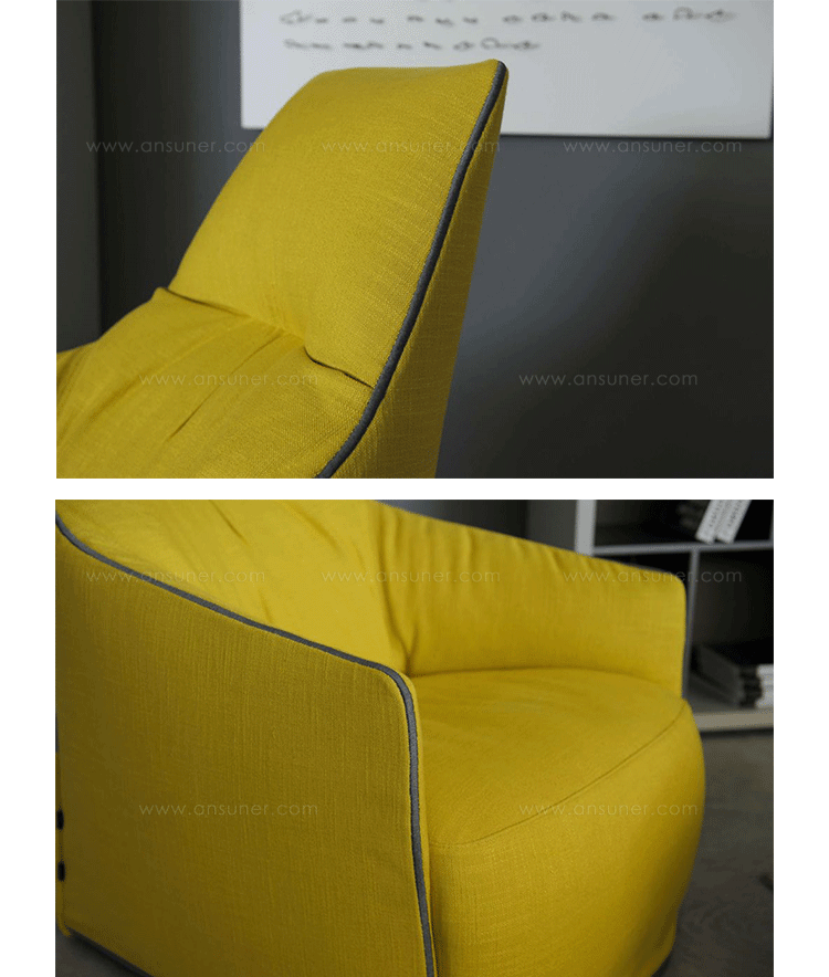 "The Santa Monica Lounge armchair,characterized by a unique design,is a project conceived by the French designer Jean-Marie Massaud,and it is produced by Poliform,a leading company in the made in Italy furniture manufacture.The Santa Monica Lounge armchair on sale in our showroom is matched with the Santa Monica ottoman.Both the items are covered in fabric,yellow colour,with iron coloured stitches."