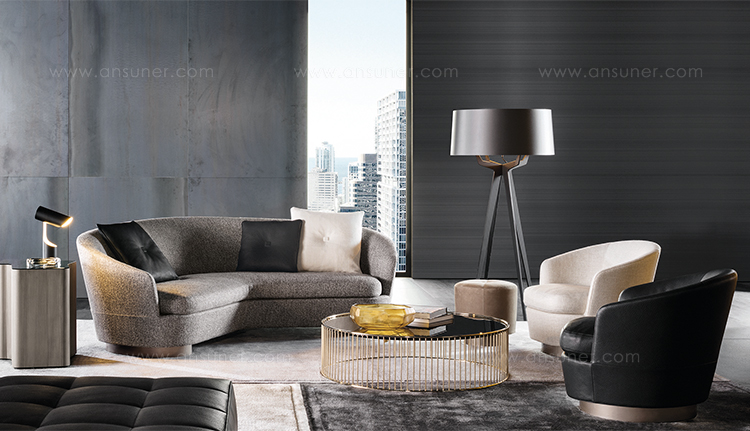 柔和的造型、紧凑的比例和具有视觉冲击力的细节呈现出精致的美学语言,金属基座采用淡铜色的表面设计。