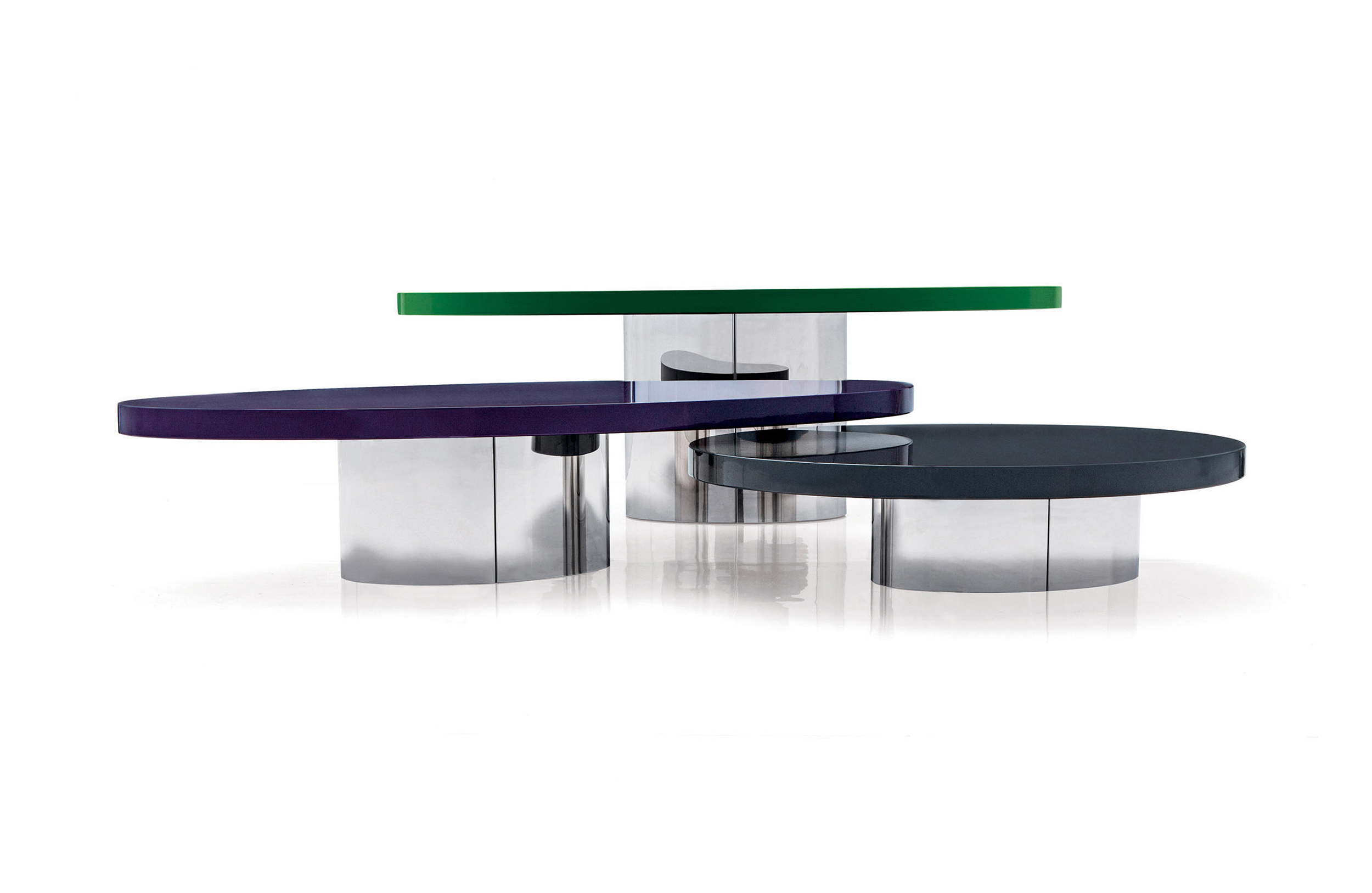 体积与造型的游戏,大胆的不对称性,一切似乎是对地心引力的挑战。这就是Raymond的美学理念。这款产品有两种高度可供选择,61厘米和74厘米。椭圆的造型是基座和台面的主题元素,基座采用镀铬金属制成,台面的亮光漆色彩缤纷:白色,Sand色,紫色,绿色和花岗石色。