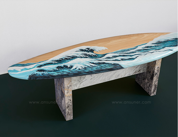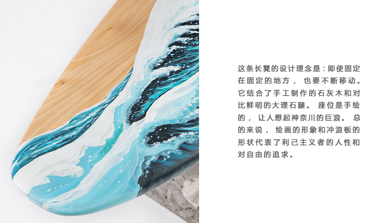 这条长凳的设计理念是:即使固定在固定的地方,也要不断移动。它结合了手工制作的石灰木和对比鲜明的大理石腿。座位是手绘的,让人想起神奈川的巨浪。