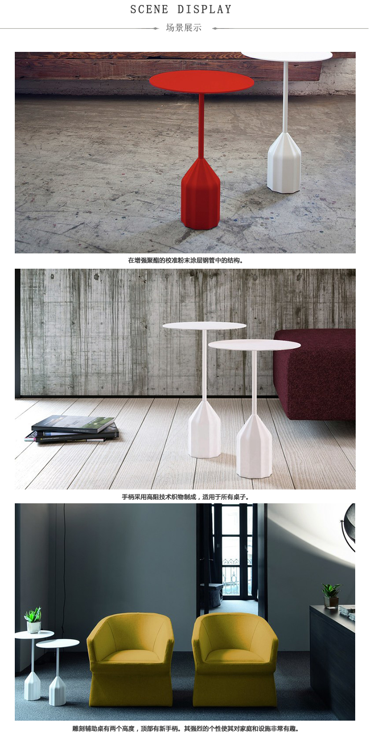 雕塑辅助桌有两种高度可供选择。其强烈的个性使其对家庭和设施非常有趣。聚氨酯泡沫底座,带钢配重(10kg),校准钢管结构粉末涂有增强聚酯。漆面MDF顶部。桌子采用单色漆面。
