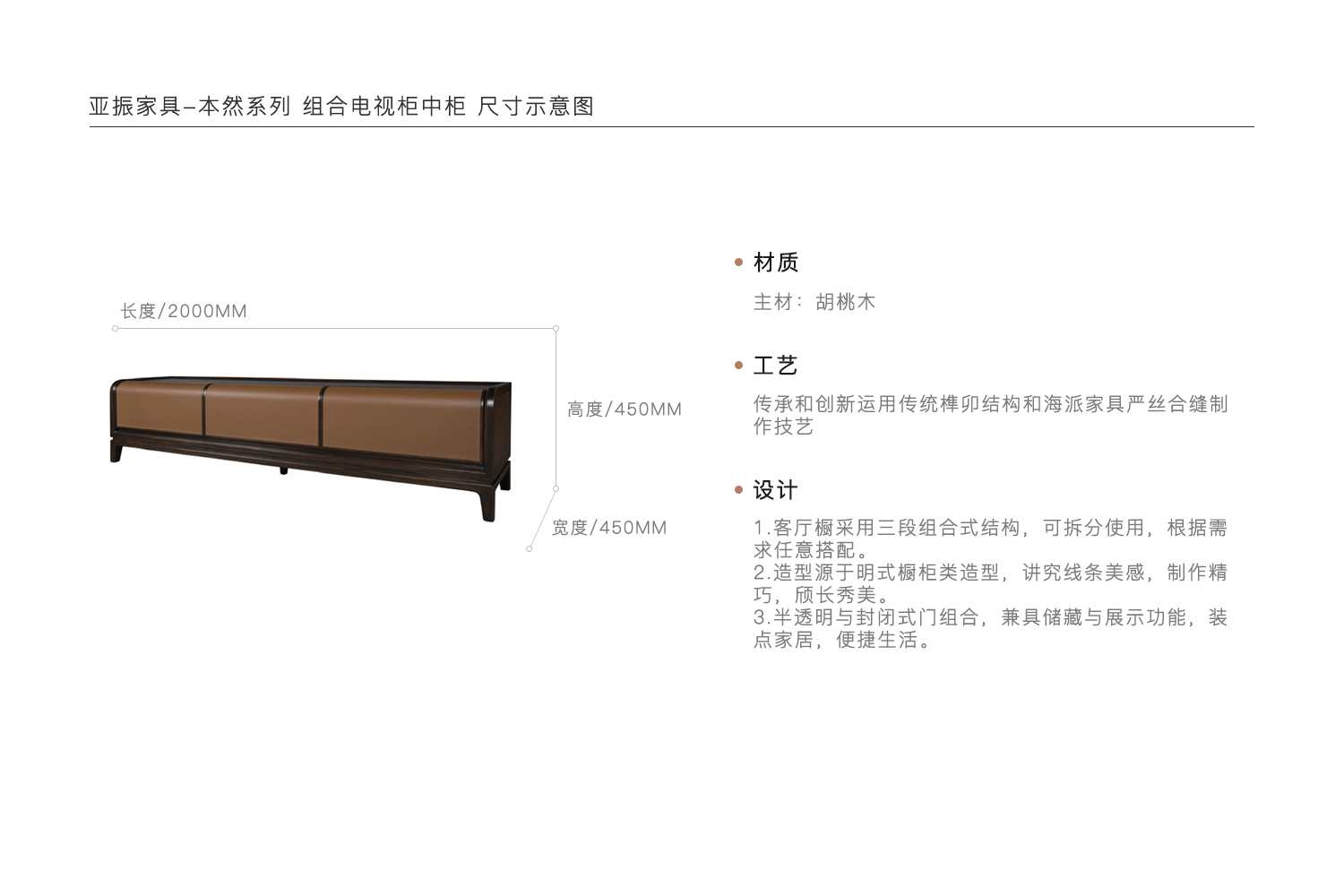 1.客厅橱采用三段组合式结构,可拆分使用,根据需求任意搭配。 2.造型源于明式橱柜类造型,讲究线条美感,制作精巧,颀长秀美。 3.半透明与封闭式门组合,兼具储藏与展示功能,装点家居,便捷生活。