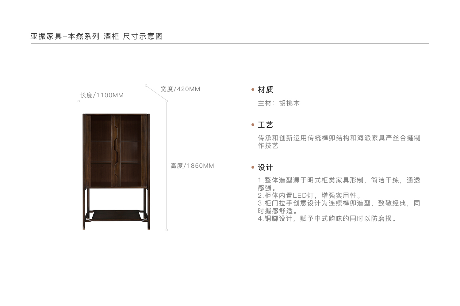 1.整体造型源于明式柜类家具形制,简洁干练,通透感强。 2.柜体内置LED灯,增强实用性。 3.柜门拉手创意设计为连续榫卯造型,致敬经典,同时握感舒适。 4.铜脚设计,赋予中式韵味的同时以防磨损。