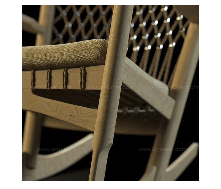 Rocking Chair(摇椅)是大师Hans J. Wegner设计的众多摇椅中的经典之作。摇椅具有简洁的线条,精准的的人体工学结构,是Hans J. Wegner在1944年为身怀六甲的妻子设计,扶手前端微微向外展开,是为让妻子方便起身。实木制成,轻便耐用,简约单纯,仍于潮流中立于不败之地,为Hans J. Wegner最受欢迎的经典作品之一。我们已经能从中感受到圈椅的影子。摇椅水曲柳制作,坐垫麻布软布(内部填充优质海绵),棉绳编织(有白色,黑色,棕红色可选)。