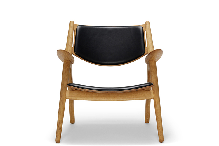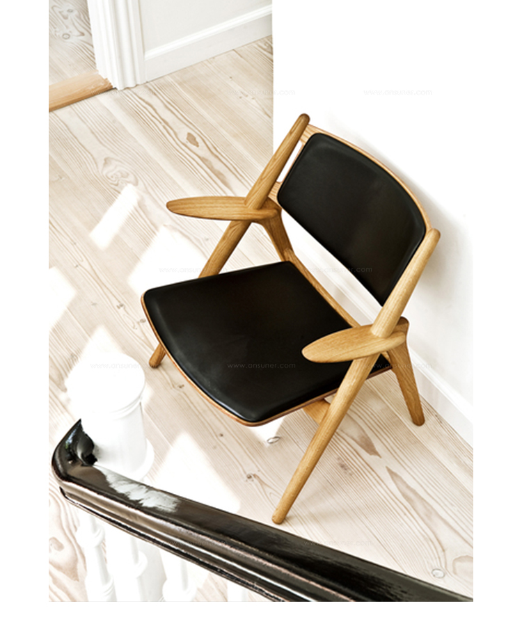 "Hans Easy Chair(汉斯简易椅)设计于1952年,2007年重新生产,是Hans J. Wegner的杰作之一。椅子的独特的造型腿形也是它最鲜明的特点。另外宽阔的扶手和较低的座板靠背都增加了这把椅子的舒适性。椅子可提供纯水曲柳实木框架、靠背曲木弯板版,也可添加织物或皮革坐垫及靠背。"