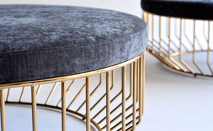 Blending sloping angles and taut lengths of bent metal are a modern interpretation of the wiry idea initially conceived by Warren Platner.The series is made up of a suite of tables,side tables and benches and fitted with luxurious solid wood or upholstered tops.