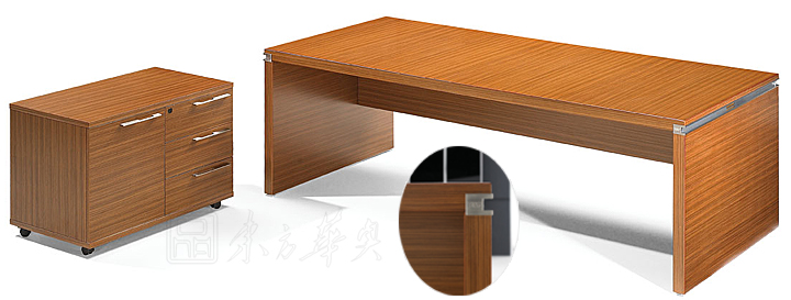 ※ 上图为大班台不同角度的展示,突出每个细节做工的精细,让我们对工艺的细腻产生美的视觉冲击,采用柚木MFC(美耐板),木析纹理清晰明快,与铝合金的搭配相得益彰。内藏钢架,保证结构与台面的强度。侧板与台面之间开有线孔,保证主台外观完整又兼顾了线路管理需求!
