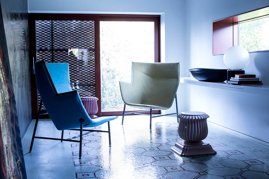 纸飞机起源于一种基于图形纸的织物设计:它的形状来自于纸张的折叠和造型,作为对形式和结构的探索,创造出角度、线条和多边形。它看似简单,却需要高超的裁剪技巧:面料的线条必须与椅子的几何结构完美结合,这意味着没有犯错的余地。