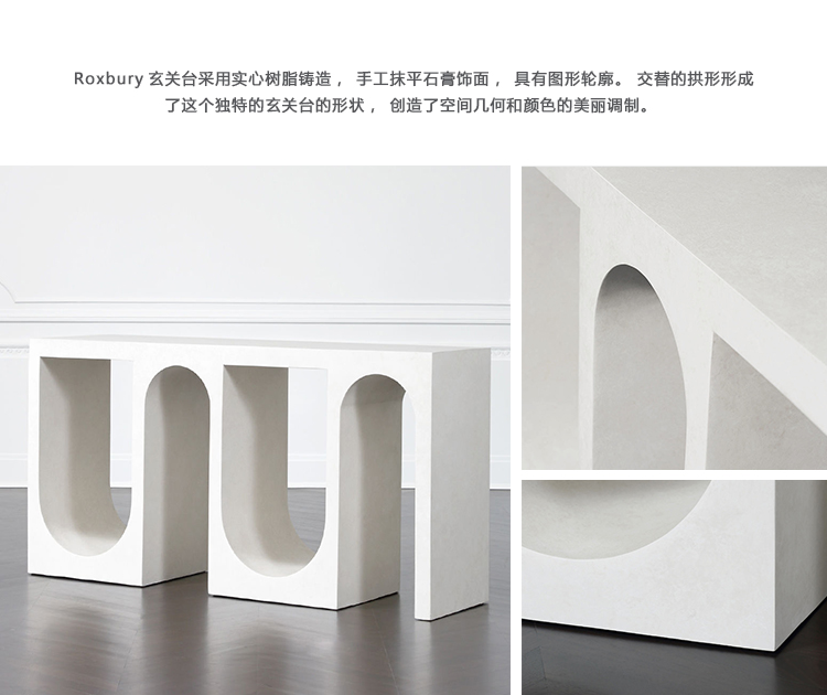 Roxbury玄关台采用实心树脂铸造,手工抹平石膏饰面,具有图形轮廓。 交替的拱形形成了这个独特的玄关台的形状,创造了空间几何和颜色的美丽调制。