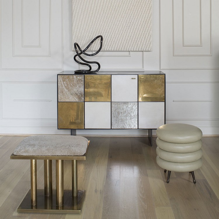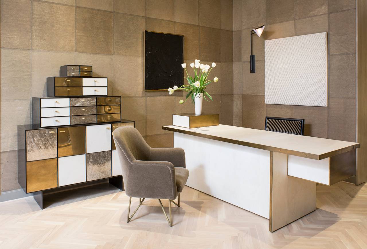 Huntley Cabinet(亨特利柜)是由黑色不锈钢机身和美丽的美国胡桃木内饰组成。在操作台部分的四扇门后面,一个可移动的内部搁架显露出来,而堆叠的金字塔形状以传统燕尾滑动抽屉为特色。 白色羊皮纸,手工制作的透明种子玻璃,古董镜子和抛光青铜,抽屉和门前面交替,全部装饰有手工雕刻的拉链。