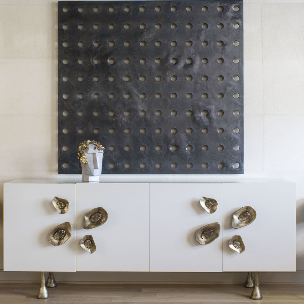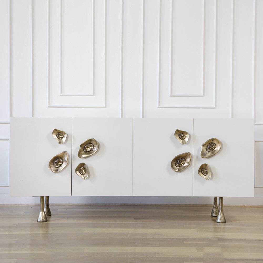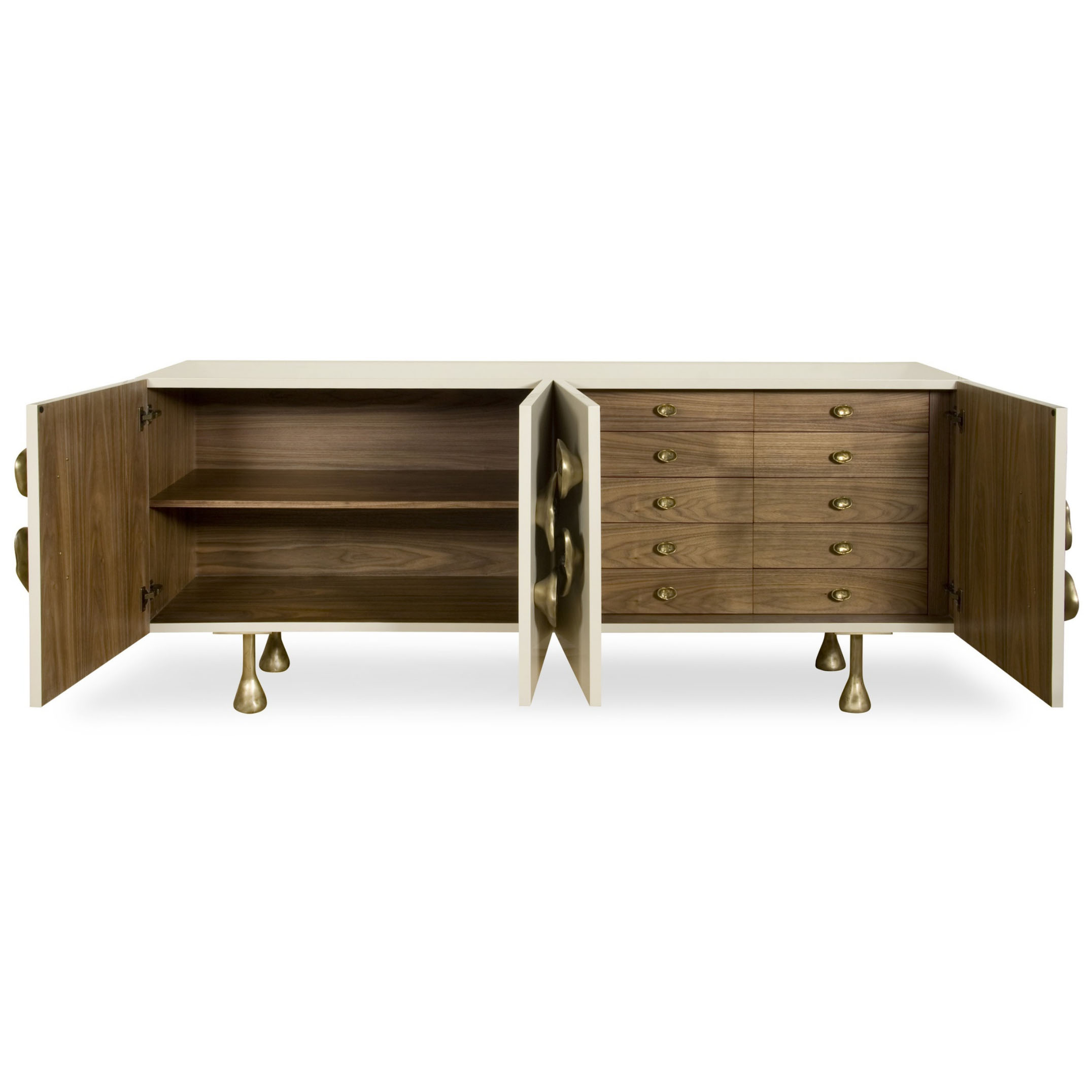 Crescent书橱的超大雕塑装饰为这款大型控制台带来丰富而不可否认的优雅气质。 坚固的美国胡桃木表壳,采用华丽的象牙色漆面漆制成,有铸造黄铜腿。 正面采用实心黄铜制成,带有手工切割的铸造玻璃中心。 内部设有四个浅抽屉,带有柔软的紧密硬件和手工雕刻的黄铜拉手,以及两个内部坚固的切割胡桃木架子。 天然胡桃木内饰,抛光黄铜抽屉拉,黄铜门拉和腿,碎玻璃。