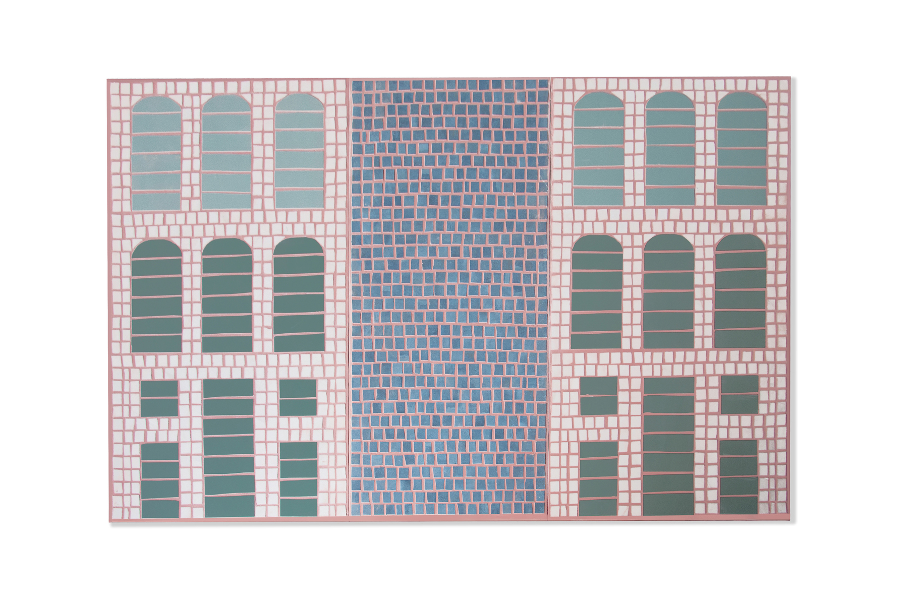 一块马赛克地毯,庆祝米兰阿伦加里奥宫殿80周年及其由建筑师Portaluppi、Muzio、Magistretti和Griffini签署的项目。 在建筑立面上再现不对称几何形状的相同大理石砖被投射在非织造织物上。