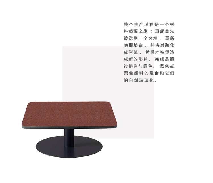 自然力量的压倒性和原始力量激发了Giulio Cappellini创造了Break Stone桌子并扩展了公司的标志性线条。 顶部采用圆形和方形设计,顶部采用埃特纳火山山坡上的熔岩石制成,传递出独特的触觉和视觉感受。 整个生产过程是一个到达材料起源的旅程:顶部首先被送到烤箱重新唤醒熔岩石并将其熔化回岩浆,然后它被塑造成新的形状。 通过熔岩与绿色,蓝色或栗色颜料的融合以及它们的天然玻璃化来实现精加工。 黑色漆钢的基础结构。
