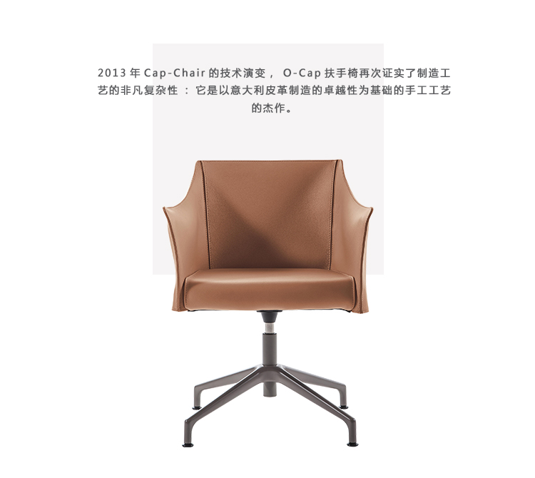 2013年Cap-Chair的技术演变,O-Cap扶手椅再次证实了制造工艺的非凡复杂性:它是以意大利皮革制造的卓越性为基础的手工工艺的杰作。