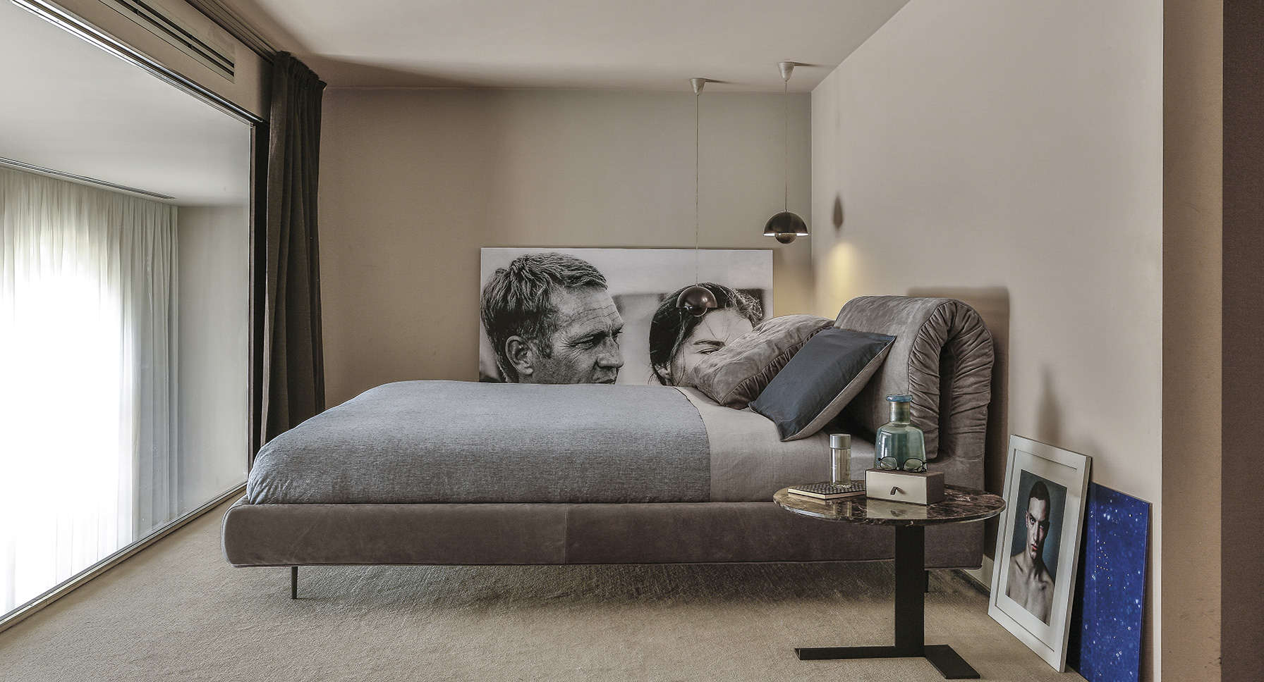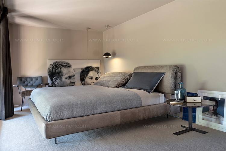 枕头可以藏在床头板后面,床头板有一种柔软的可以折叠的装饰性特征。这崭新的细节,为一个柔软别致的床。