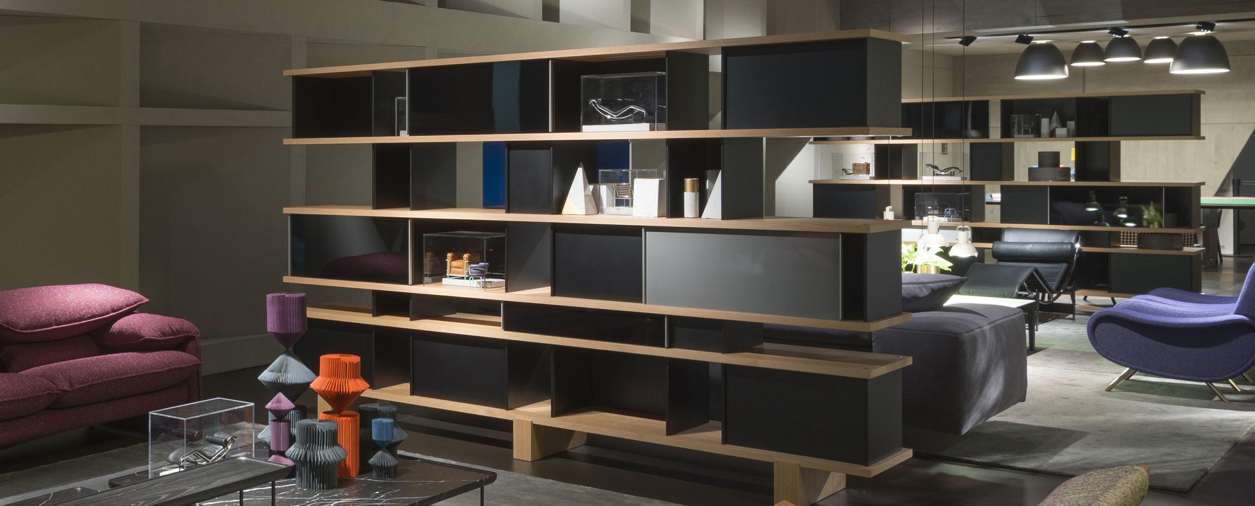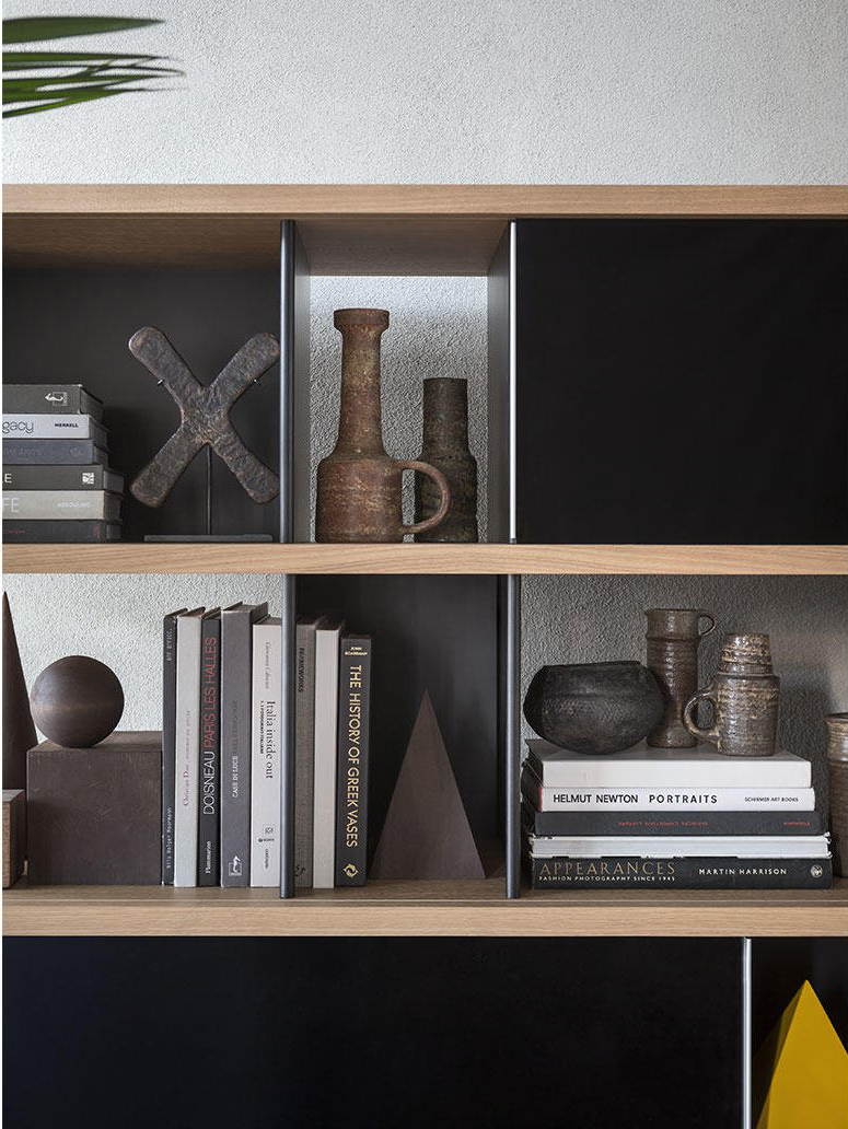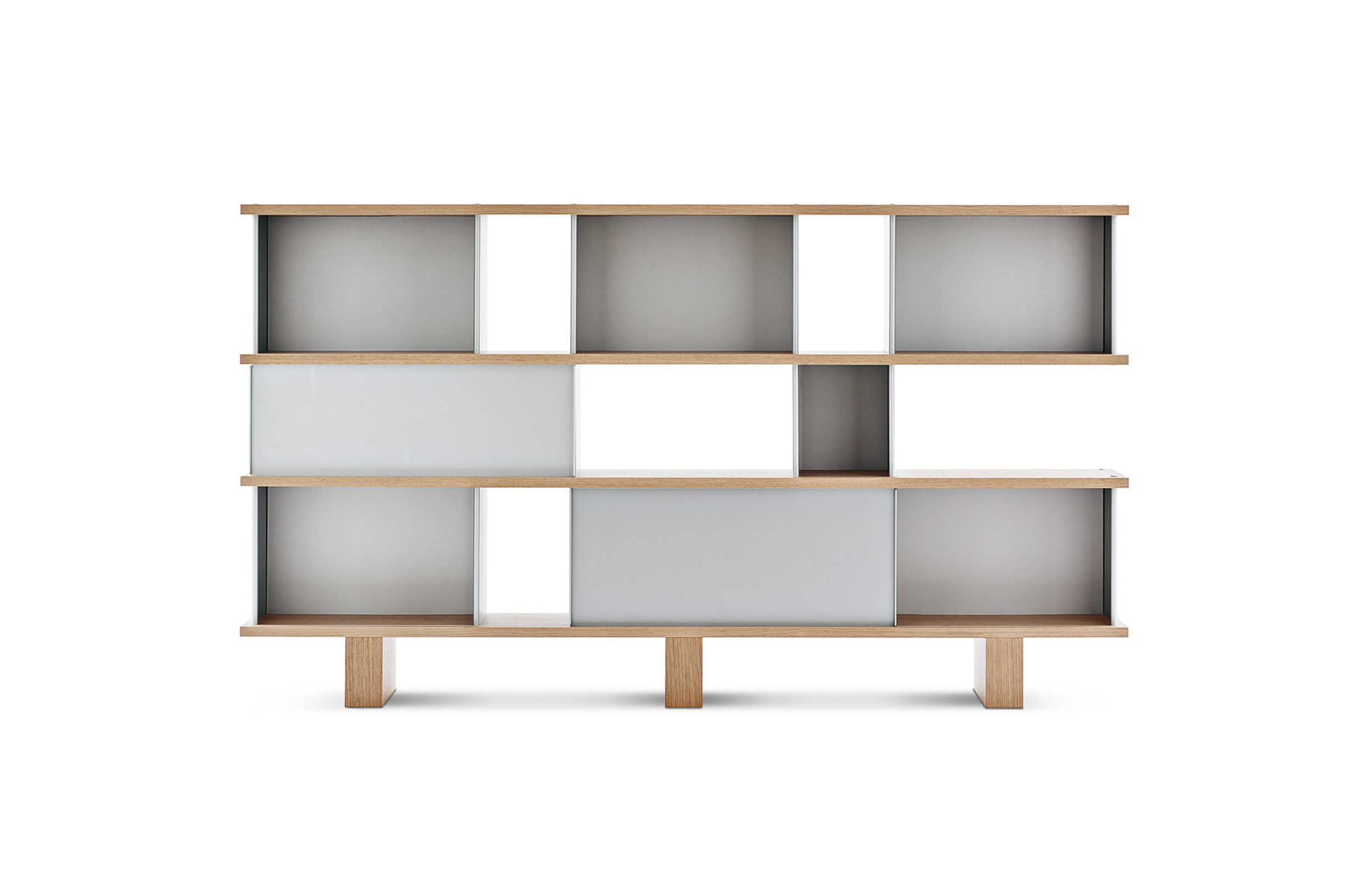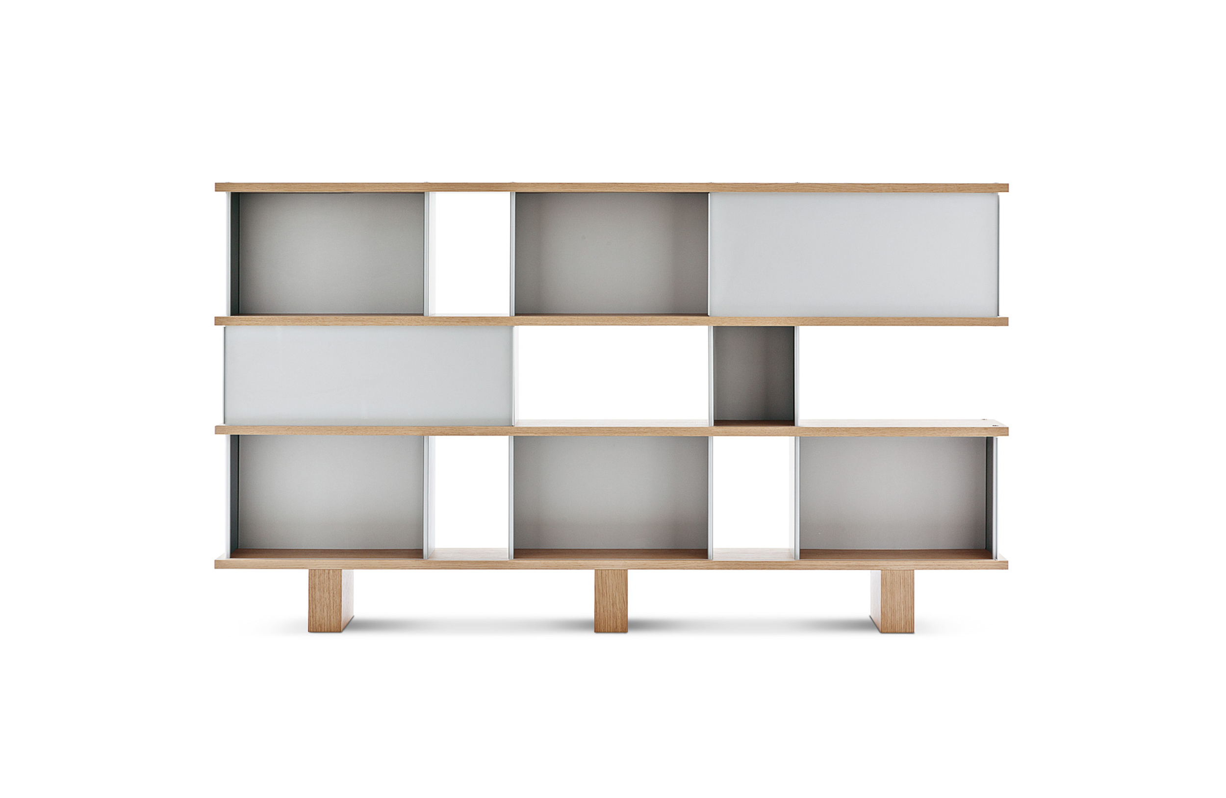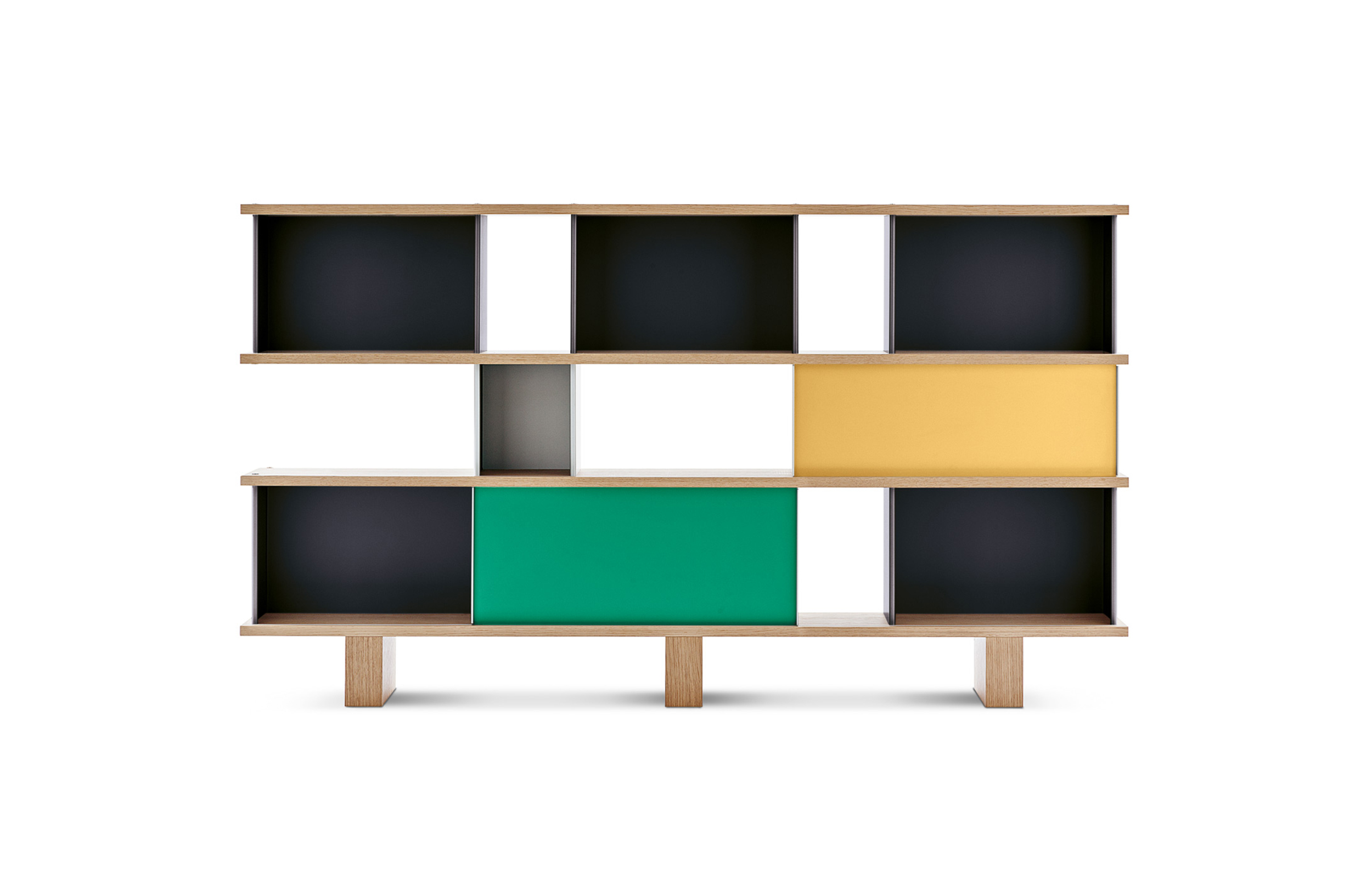 该系列包括餐边柜、碗柜和书架等,采用地面支撑或对称及非对称悬架,还包括与空间建筑风格相匹配的独立式书柜。基本单元组件为橡木搁架,阳极处理或黑色漆面的铝质单元。包括5种不同的高度,以实现物品和书籍不同风格的最佳布置。每种家具都配有附件,如铝盘等。书架滑轨采用阳极氧化铝、红色、蓝色、绿色、黄色、灰色、白色或黑色漆面。这款模块化书架由Charlotte Perriand设计,结构化处理运用巧能生精。对女设计师来说,每个模块结构并非一个单纯的块面,经过玩味地组合能有让人欣喜的效果。这件作品高度表现了Perriand在家具设计上的先锋精神,其对建筑艺术性、居住性,生活的信仰。