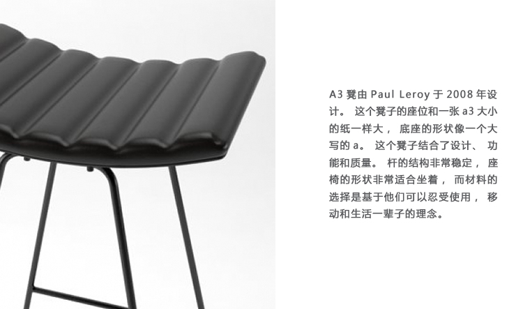 A3凳由Paul Leroy于2008年设计。这个凳子的座位和一张a3大小的纸一样大,底座的形状像一个大写的a。这个凳子结合了设计、功能和质量。杆的结构非常稳定,座椅的形状非常适合坐着,而材料的选择是基于他们可以忍受使用,移动和生活一辈子的理念。