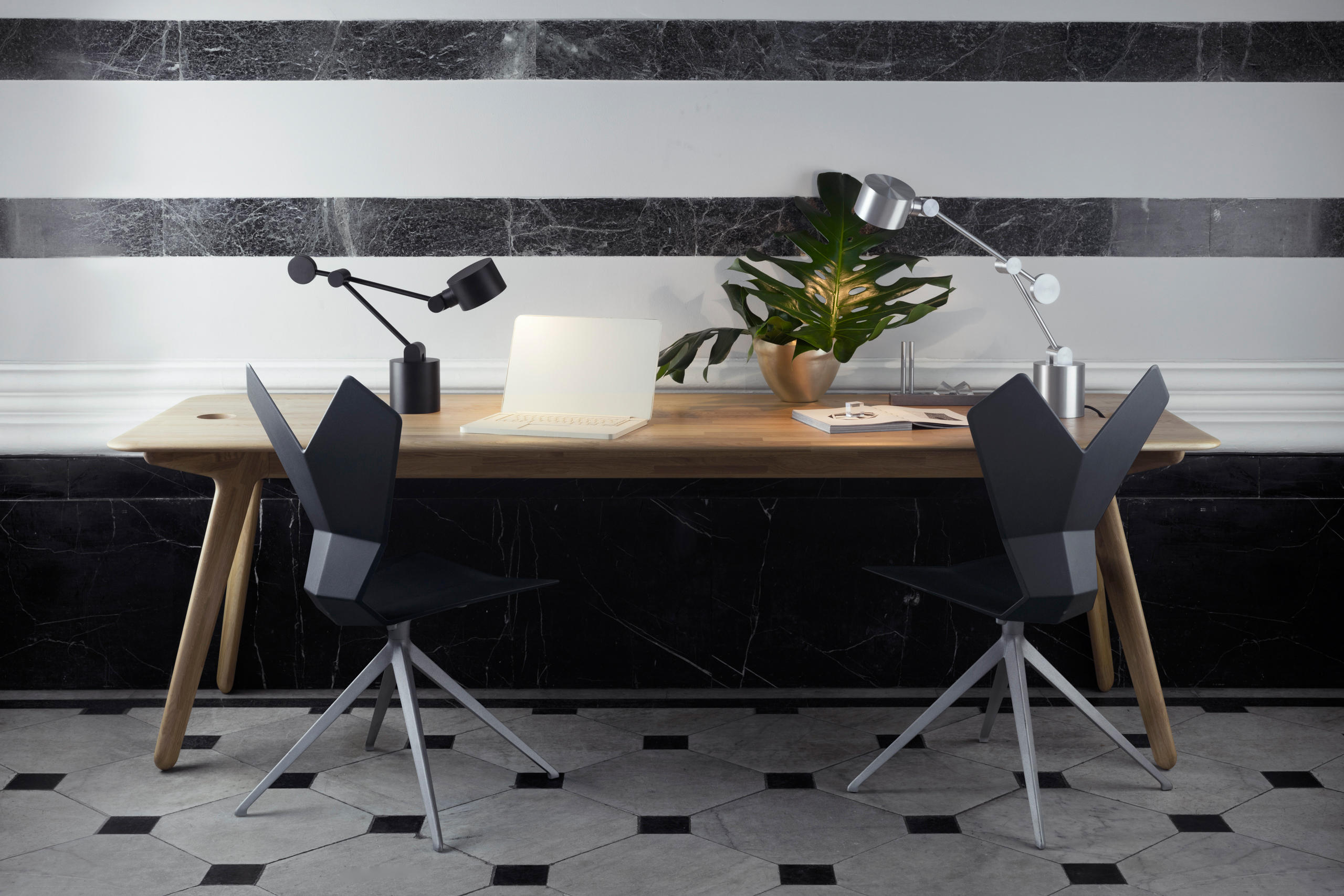 板形餐桌可使用自然漆或黑色漆完成。保留橡木的自然美,板坯收集是一系列以诱人的简洁的角度形式建造坚固的作品。表面被刷得很深,露出了颗粒。用黑色或天然漆完成。板坯收集包括一个酒吧凳子,椅子和桌子。