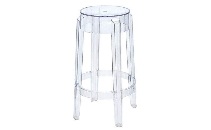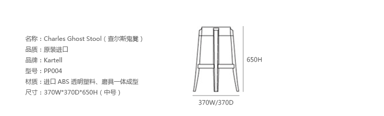 "Charles Ghost Stool(查尔斯鬼凳),由鼎鼎大名Philippe starck(菲利浦·史塔克)设计;进口高透明度工程塑料PC一体成型,简洁新潮,高净度透明材质很好的表现出产品的时尚和百搭,可以毫不夸张的说,几乎配任何装修风格他都很灵,而且显品味,空间感也很好,如果你的吧台空间不大的话,放这款吧椅视觉很通透,不占地方。"
