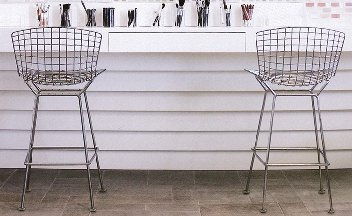 bertoia stool(伯托埃凳)是美国设计师伯托埃设计的,1950年,Harry Bertoia尝试用钢枝制造出结实、轻便而又经济的椅子。1952年,他通过弯曲的金属棒来设计出这张极具创意的伯托埃吧椅(Harry Bertoia Barstool),这张椅子适用与餐厅、酒吧、高档会所等地,利用了金的外形给椅子赋予了现代感,因为生产简单、材料简便,时候大规模的生产,非常适用于商业空间,这或许就是设计的力量可以改变 经济结构吧。