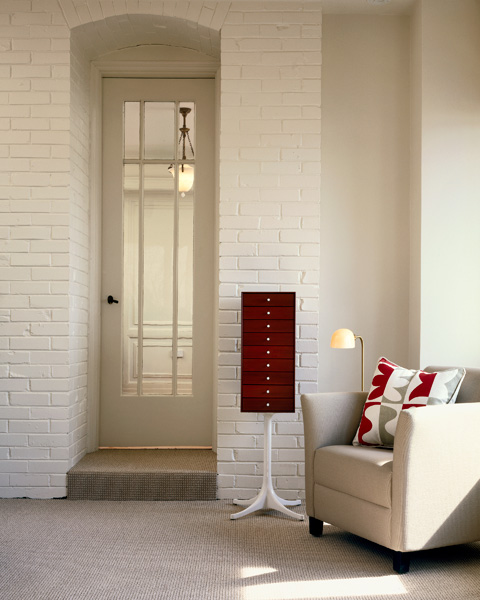 乔治·尼尔森(George Nelson)是美国极具影响力的建筑师、家具设计师和产品设计师,日本对George Nelson有着深远的影响。在他于1951年第一次到东京旅行,以及之后在那里的十几年,George Nelson迷上了日本的所有东西。这种影响最明显的的他于1952年设计的迷你箱。迷你箱的神奇处是可用来存放各种物品,是一个很多小抽屉小储物柜,方便您分类摆放各种生活物品。尼尔森设计的迷你箱最让人惊奇的是它几乎可以摆放在任何房间,无论是卧室,办公室,客厅等等任何您需要的地方,美观且不失和谐。每个抽屉都是木工们细心的安装设计,以保证高品质。抽屉采用胡桃或樱桃木皮贴面,基材为环保高密度板环保油漆喷涂、铸铝烤漆可调节脚架(4星级铝底座)、或玻璃钢一体成型脚架,抽屉贴心的配置有金属旋钮,方便打开与关上。
