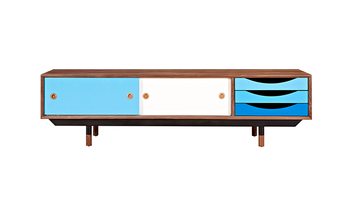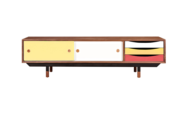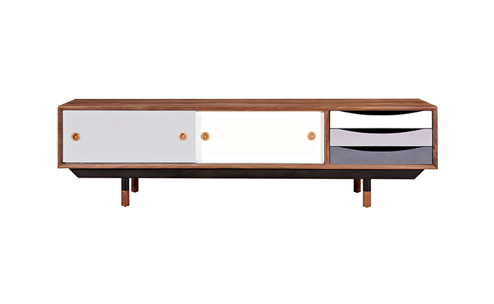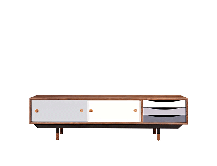 color theory media cabinet(色彩原理电视柜)是Kardiel公司制作的经典实木家具,具有世纪中期的现代风格,设计于1955年。配有三个梯度的滑动抽屉和两个隐蔽的推拉门的小隔间,存储容量非常大。在现代主义的存储家具上, Finn Juhl和 Arne Vodder 最先尝试胶木和天然木的组合运用。这是大胆的创新,他们结合传统的新鲜的新兴技术与现代主义的概念。制作采用精选MDF板基材胡桃木或水曲柳木皮贴面、胡桃实木或水曲柳实木脚架、环保油漆喷涂、做工精湛,是您理想的选择。