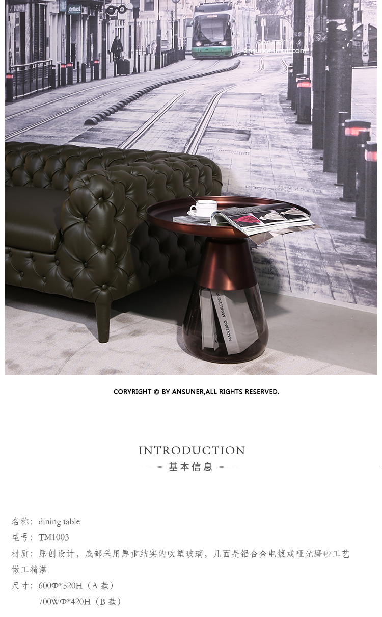 这款半透明带有色彩的玻璃和铝合金组成的手捧咖啡几,有着穿越历史长河的影子,竟像是宫廷画中拿出来的一般,底座的玻璃带给人温润如玉的视觉和触觉的通感。