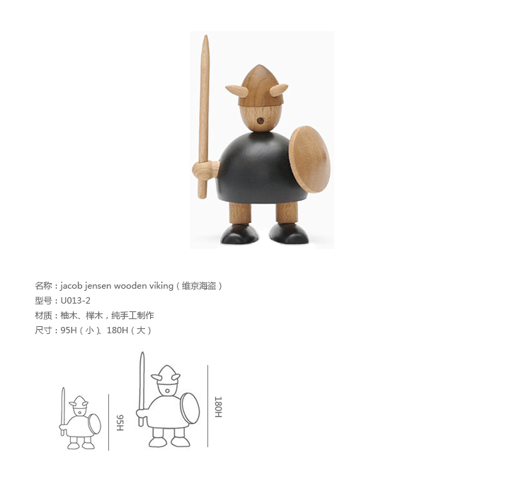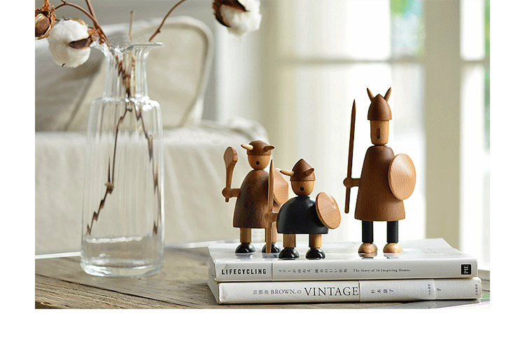 由于50年代的丹麦活跃着一股「斯堪地那维亚现代主义设计」风潮,延续低调简洁的风格并大量采用自然木材与传统工艺所迸出的美丽火花,设计大师Jacob Jensen也致力其中成为见证历史的大师之一。Jacob Jensen Wooden Viking(维京海盗)是经典的北欧形象,随着《加勒比海盗》系列电影的风靡,维京海盗在骁勇彪悍的传统形象里增加了俏皮、温暖、幽默的一面。这一组维京海盗形象为主题的北欧木雕设计,正是基于如此可爱的解读而做,摆在桌面上形成了饶有趣味的场景感,也是用来赠送的高档礼品。