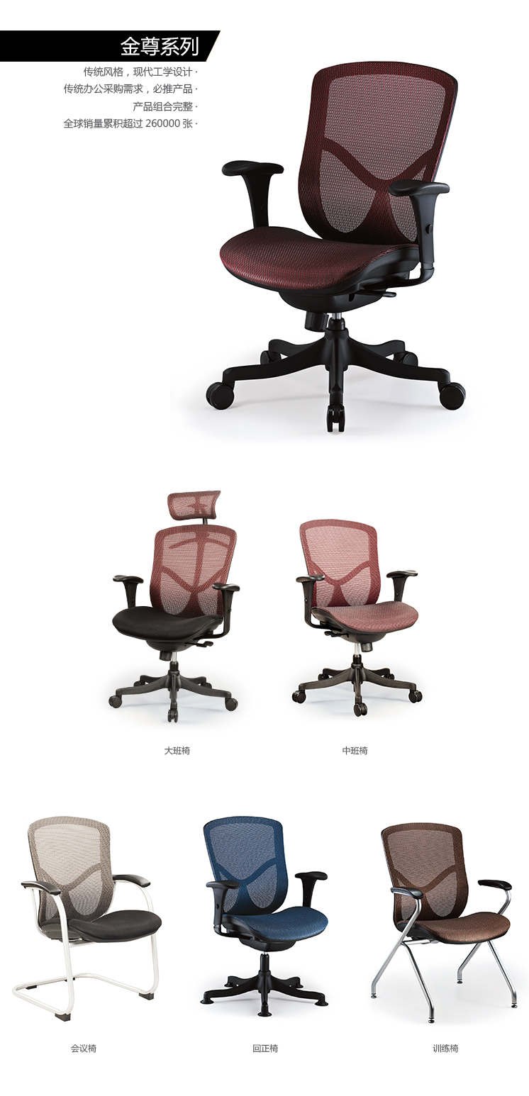 金尊系列覆盖了办公室所有用椅空间的需求,从主管、职员到访客,从办公到教育训练,皆有合适的椅型,可以说是最完整的产品组合设计