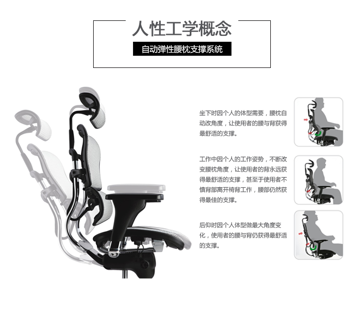 全球首创的单杆式操控底盘,一根杆操控所有功能,使办公椅的操控更加人性化;自动弹性腰枕支撑系统,无论是在坐下时、工作中、或者后仰时,都能让使用者的腰和背获得最舒适的支撑;金豪+系列采用完全性多功能调整设计,从椅背、扶手与座垫可进行全方位的调整;