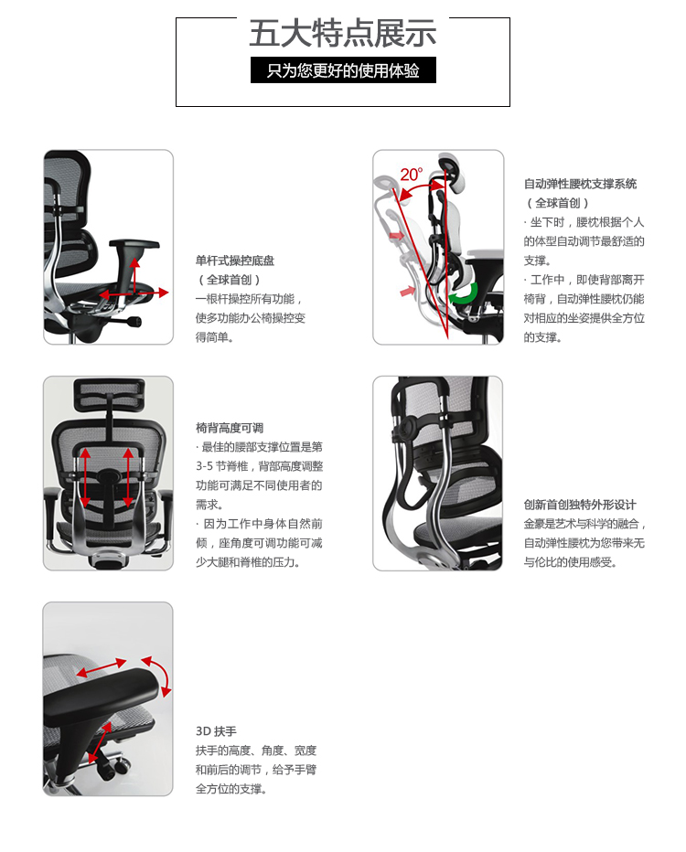 全球首创的单杆式操控底盘,一根杆操控所有功能,使办公椅的操控更加人性化;