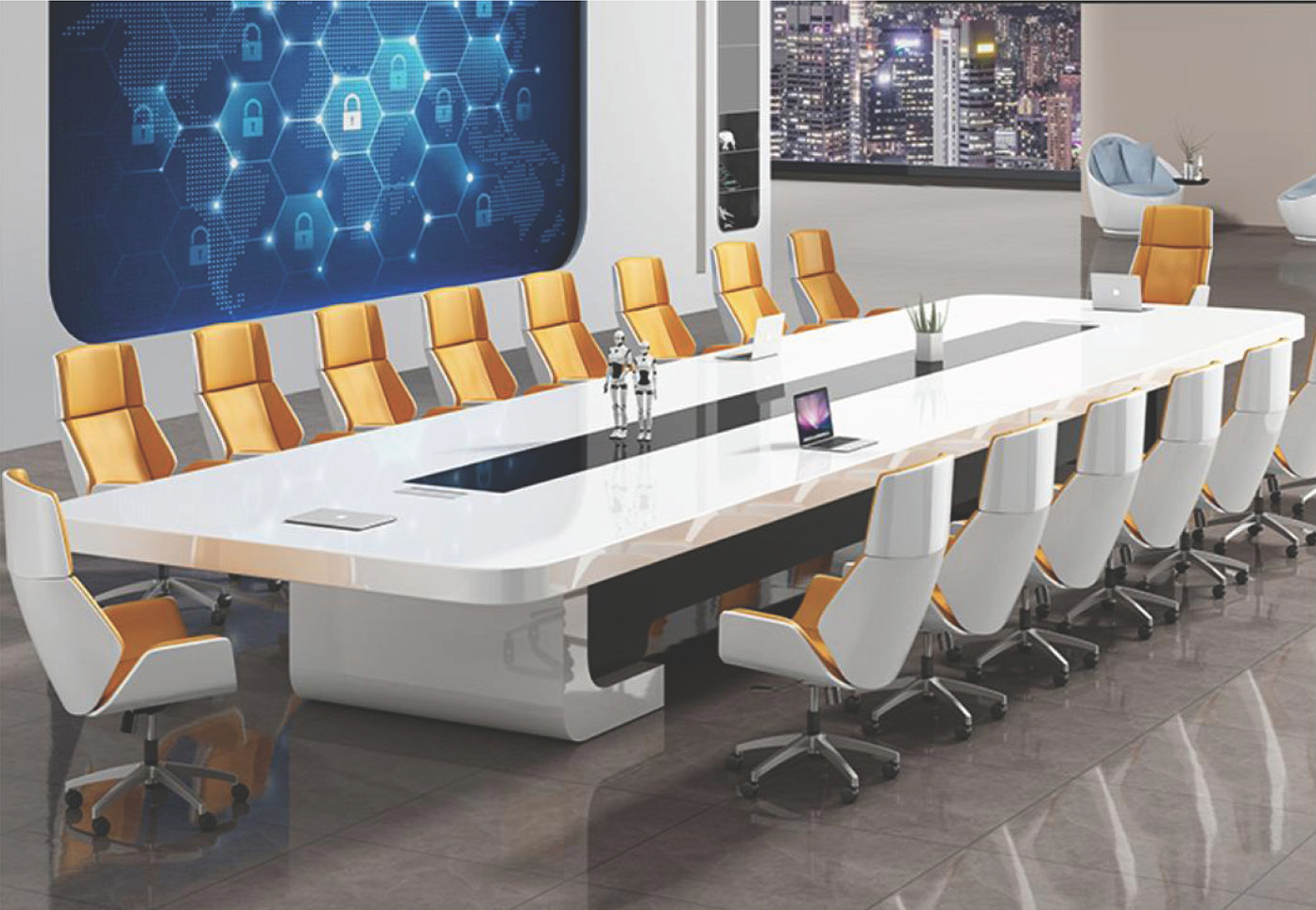 会议桌秉承系列特有的稳重和优雅,考虑到人性化的使用功能,提供了一个的小型收纳中心。不仅让整体感觉更加稳固,而且在结构上形成了强烈的对比,带来颇具视觉冲击力震撼效果。不同曲线与色彩的运用,塑造不同个性,亲和性设计风格,创适柔和,和谐的交流氛围,亦提供恬静,幽雅的休息环境。