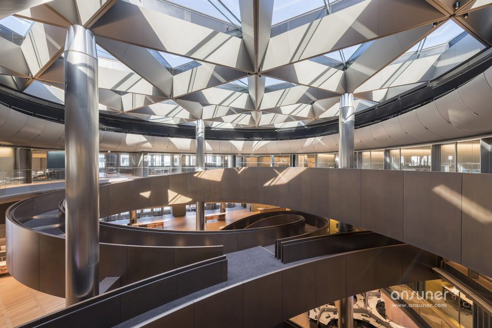 一条螺旋阶梯坡道连接起了建筑的每一层空间,它的外形呈优雅连续的环状,为空间增加了几分戏剧性。坡道采用青铜覆面,被设计成了一个连接和会面的场所。人们可以在这里简短地和同事聊上几句,而不会影响到行走中的人流。