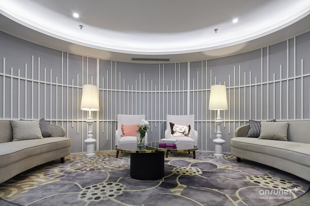 空间造型与整体结构与传统文化风水学相符。“天圆地方”的空间结构暗合天人合一的传统文化精髓,天地互为感应,其中人被视为天地万物之灵,能够感通万物,最灵者也。前厅以“山”形为背景,地面设置“水”景,意喻有山有水,藏风聚气,山水相通,气运不绝。