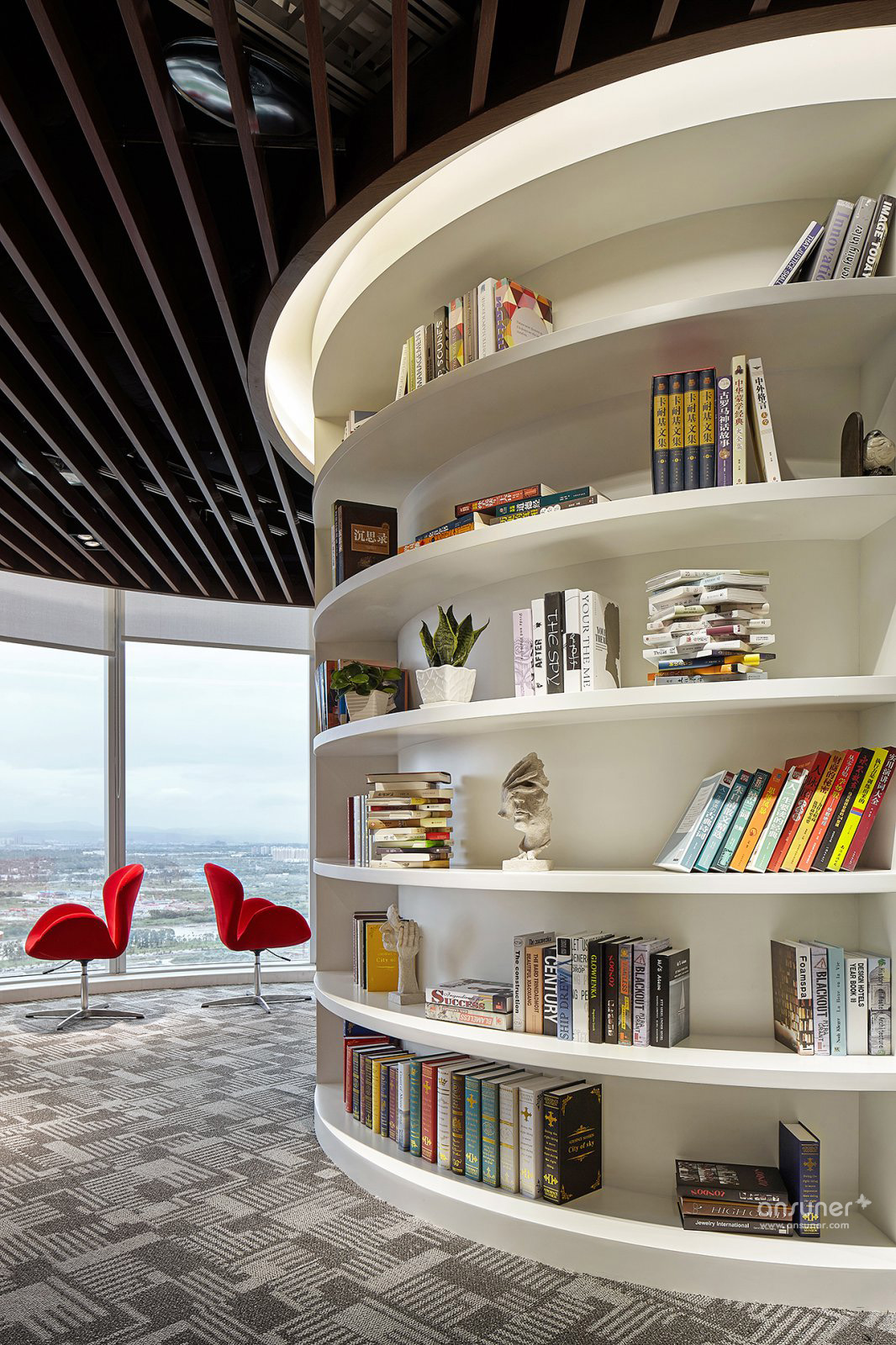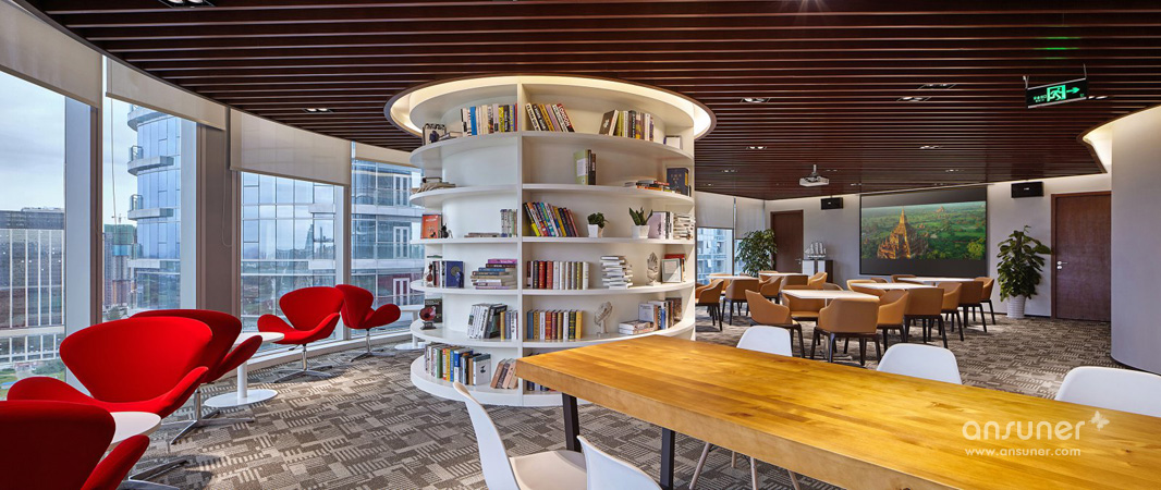 环形全落地窗、视线开阔、空间宽敞明亮。可同时容纳全体员工,兼具活动、茶歇、书吧、讨论等功能。