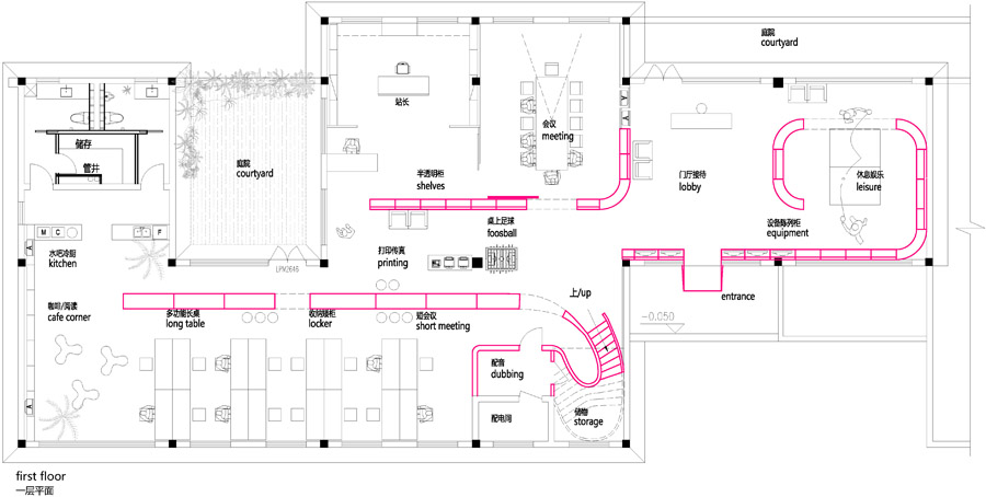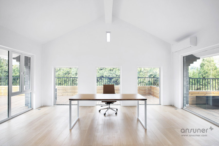 该办公室内装设计项目位于浙江省杭州,虽然基地拥有良好的室外自然景观条件,但原有建筑内部阴暗压抑:已有结构的1层层高3.3m ,梁下高度2.6m, 空间比例相对低矮;2层空间的高度具有优势,但1,2层的联系较弱,原有建筑的双层特点也并没有展现出来。