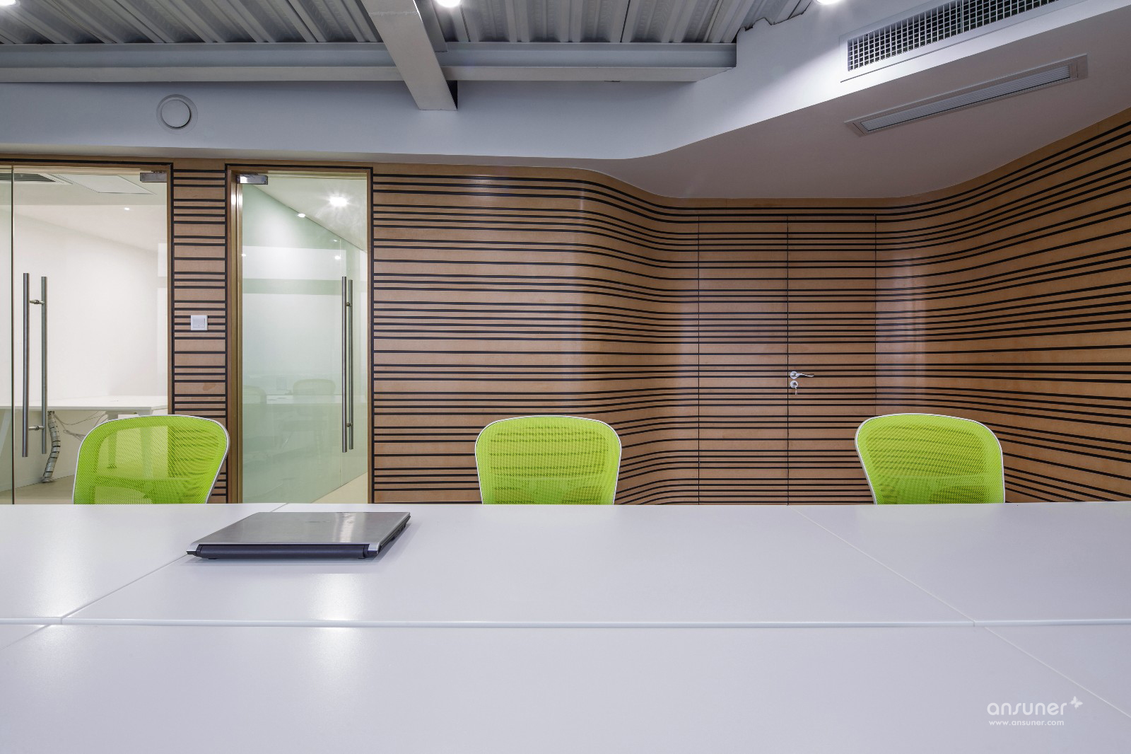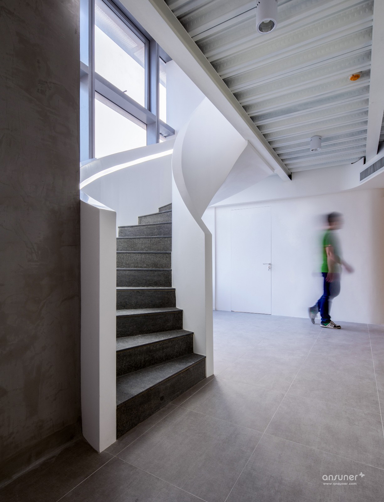 甲方最终敲定南京苏宁慧谷中心。新的办公室由5套50-70㎡不等的loft户型组合而成,一乘二的形式可以轻松获得双倍的办公面积。这也是Loft户型优点的最大体现,叠加赋予空间更强的可塑性,同时也带来层高相对局促的弊病,本案亦是如此。作为一家集产品研发、集成、销售、服务于一体的科技通信公司,业主提出了众多非常规的功能要求,如设立仓库、维修室、实验室、工具间等。这些相对独立的空间需要在布局中优化考虑,以确保实验、办公、出货的高效进行,同时还要克服空间的开阔性不够带来的采光不足等问题。如何将5套loft打通的狭长空间规划得有声有色,既满足功能需求又贴切公司的企业形象?这是设计师面临的主要问题。在此我们大胆运用了弧形线条作为主要设计元素,这样可以更加有效的对空间进行自由分割,同时打破办公室横平竖直、千篇一律的常态。从空间的布置分割到墙面的密集装饰线条,乃至楼梯的造型。曲形线、面无处不在。自由延伸的线条令人不禁遐想到无限蔓延的电波,更给人动态流畅的视觉感受。