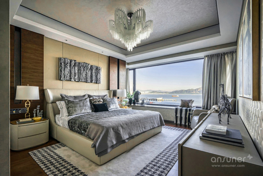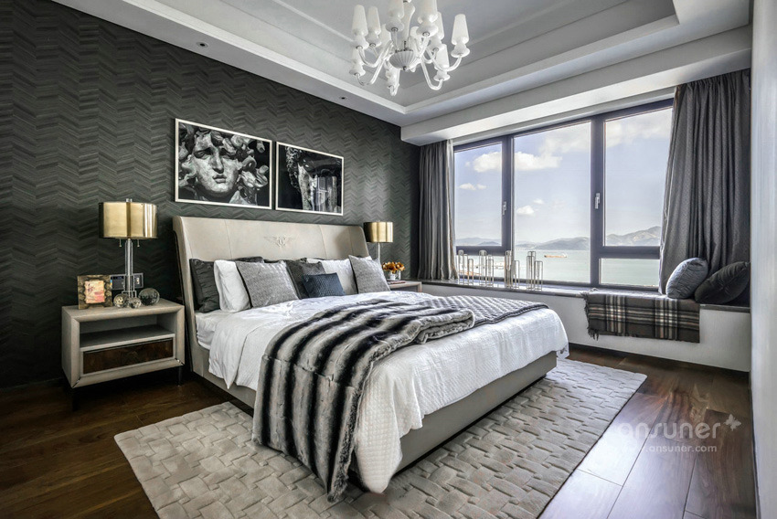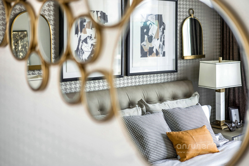 设计师利用对色彩的敏锐视角,以做旧的古罗马灰为主色调表达了主卧空间的优雅和感性,独具风情的格纹地毯,工艺精细的斗柜,艺术装饰画和精心布置的装饰品,让空间有着不同韵律的过渡。
