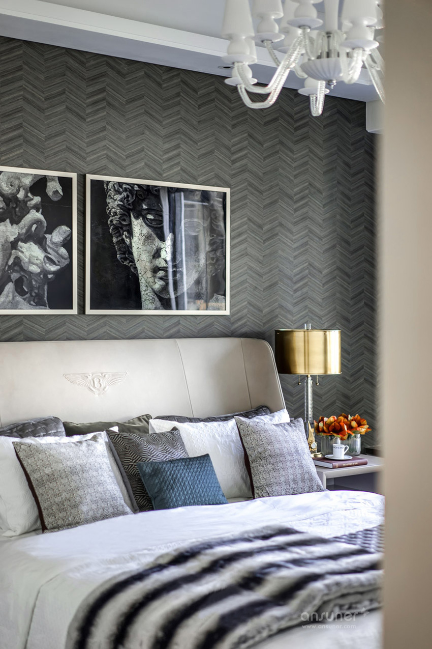 在该套样板间的设计上,设计师延续Bentley Home的低调奢华,却不囿于其中,将古罗马艺术融入其中,运用大卫画与仿旧的古罗马灰壁纸,糅合现代风尚与古罗马艺术。